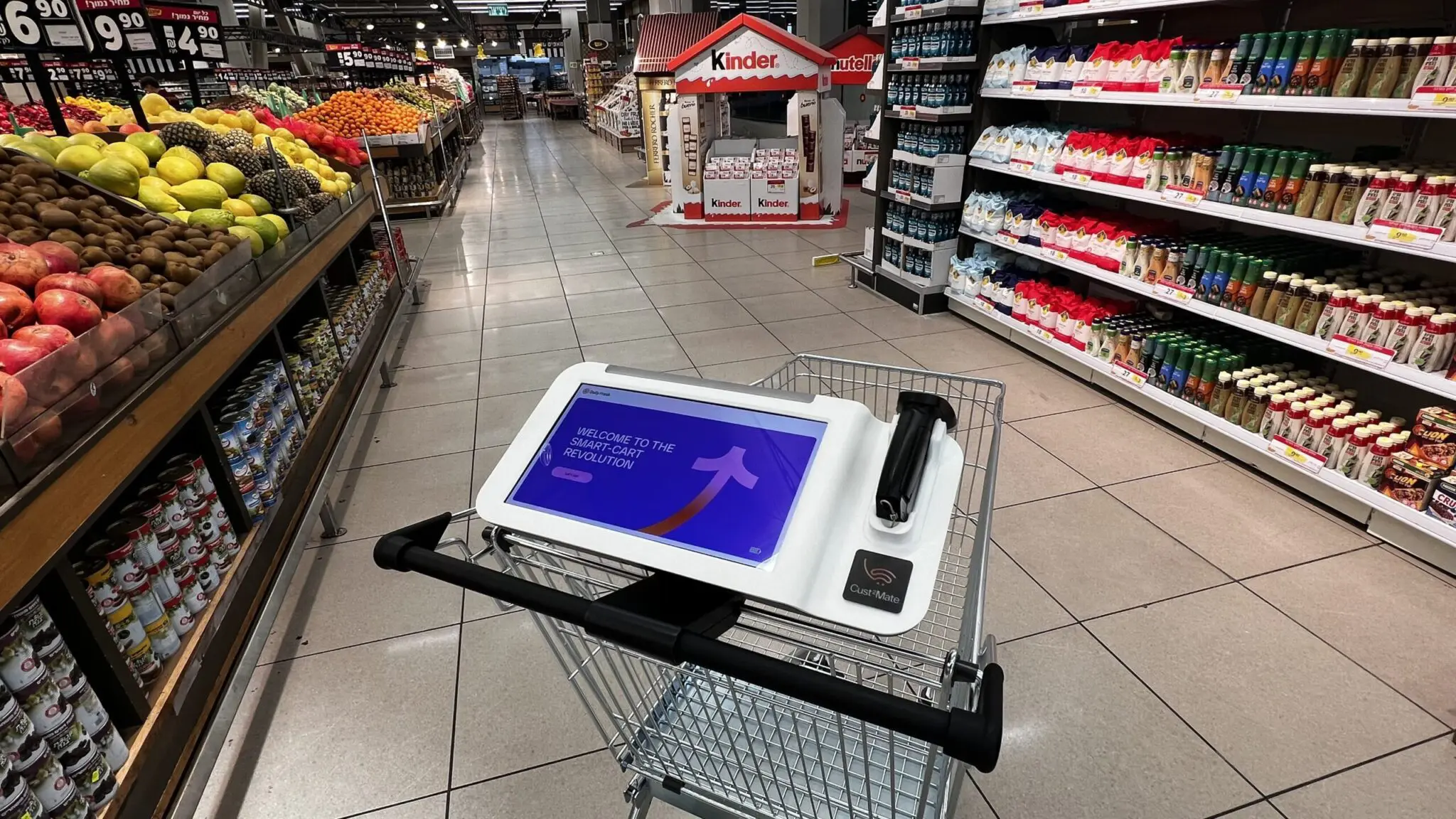The smart carts enable shopping and payment directly within the cart, eliminating the necessity of waiting in checkout lines. Equipped with a touch screen, built-in barcode reader, security scale to prevent unpaid items, and a camera documenting the shopping process, these carts also allow shoppers to view shopping lists and special messages and use various payment methods.