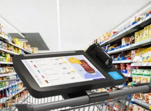 “The smart cart is highly interactive, leveraging behavioral data and on-cart touch screens to deliver personalized, context-driven, real-time product recommendations, promotions, and advertisements.”